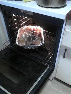 Tacchino is in the oven, apple souce and stuffingggg buonissimo sono quasi pronti. Adesso stiamo aspettando Jessie, Bryan e Aiden :) e dopo se magna